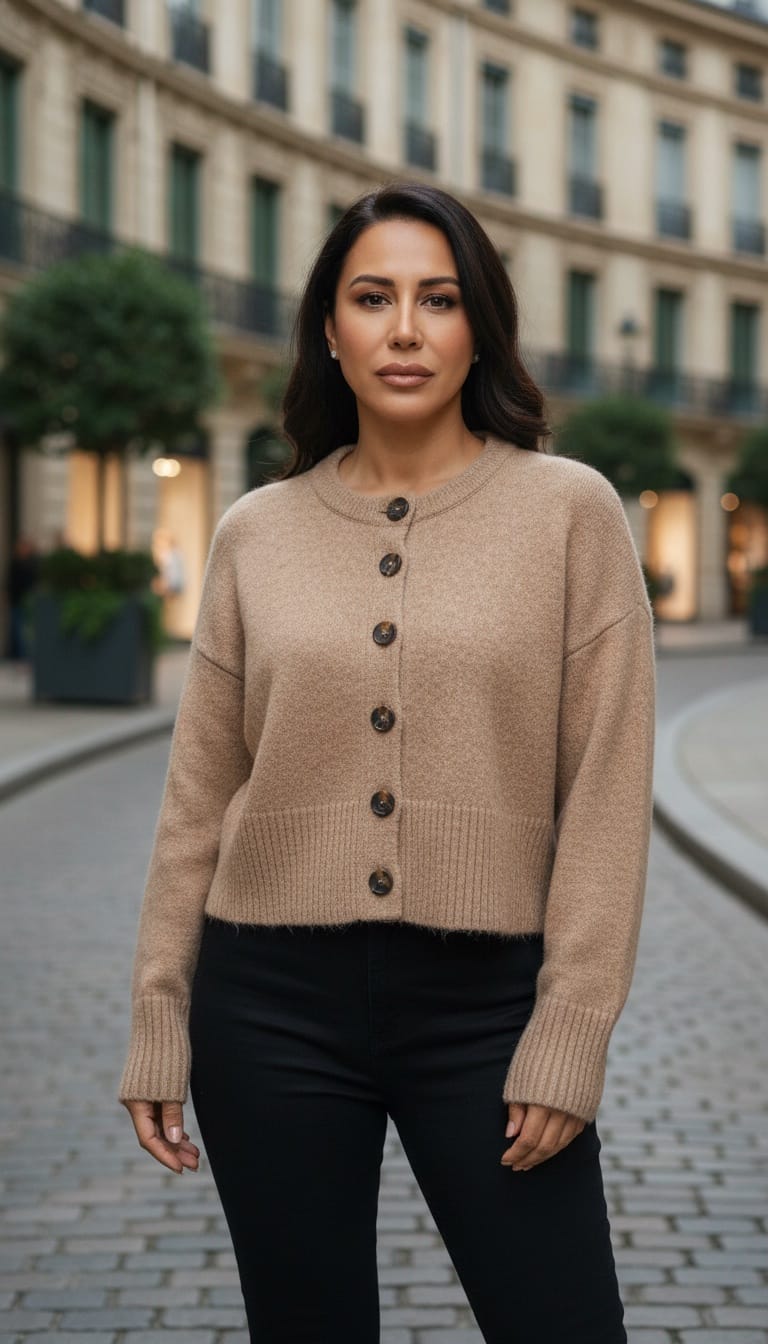 • Düğmeli: Önünde büyük, koyu renkli, kontrast oluşturan düğmeler bulunuyor. Düğmeler, hırkanın ön kısmını kapalı tutmak için kullanılmış ve bu da onu kazak gibi gösteren bir tarz yaratmış.