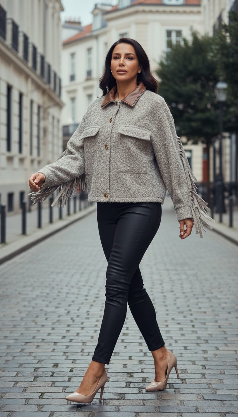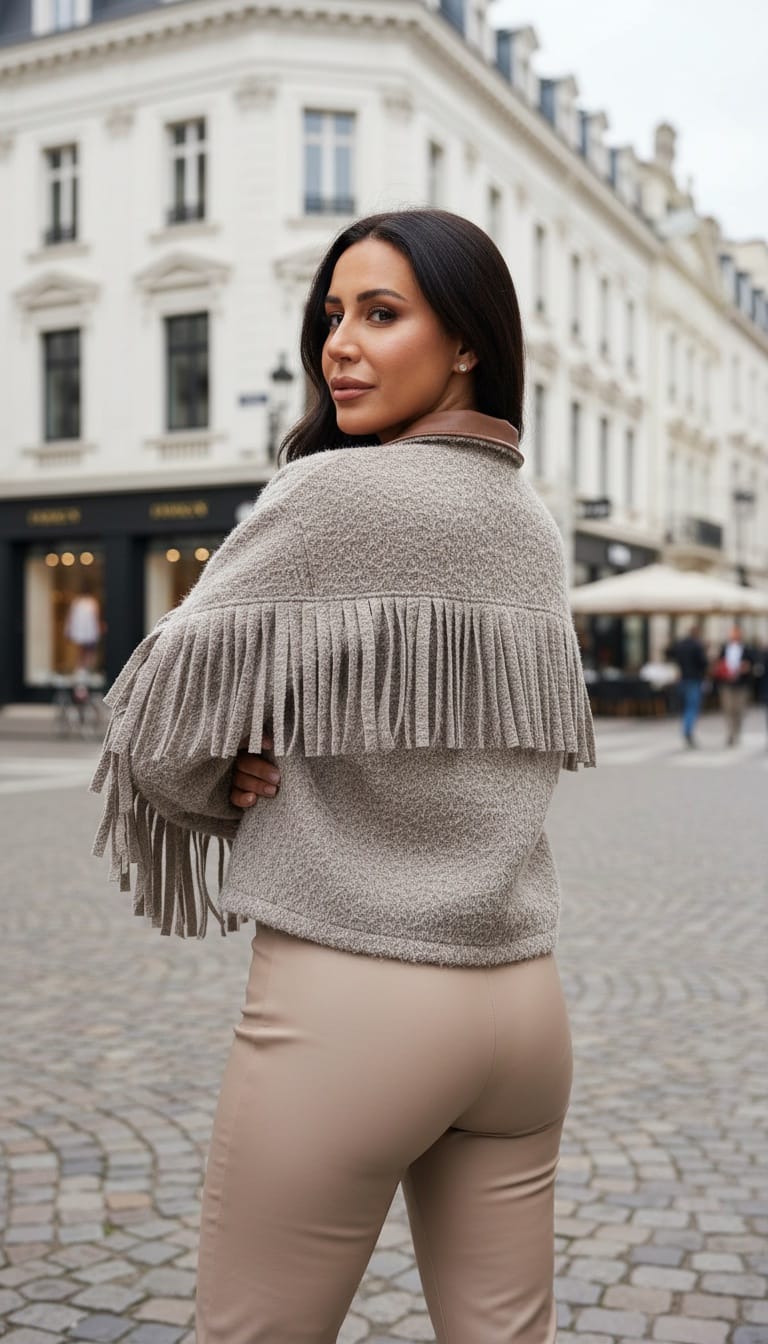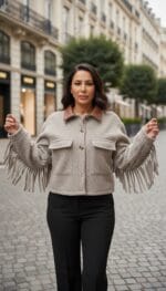 • Ana Kumaş: Ceketin ana gövdesi, bukle (bouclé) veya tüylü (fuzzy) bir dokuya sahip, yün karışımı bir kumaştan yapılmış. Rengi açık kahve, bej-gri (taupe) veya vizon gibi doğal ve nötr bir tondadır.