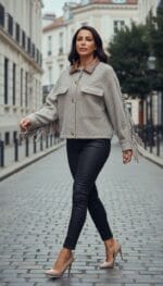 • Ceket Tarzı: Önü düğmeli, göğüs hizasında iki kapaklı cep detayı bulunuyor (ilk fotoğrafta koyu pantolonla kombinlenmiş).