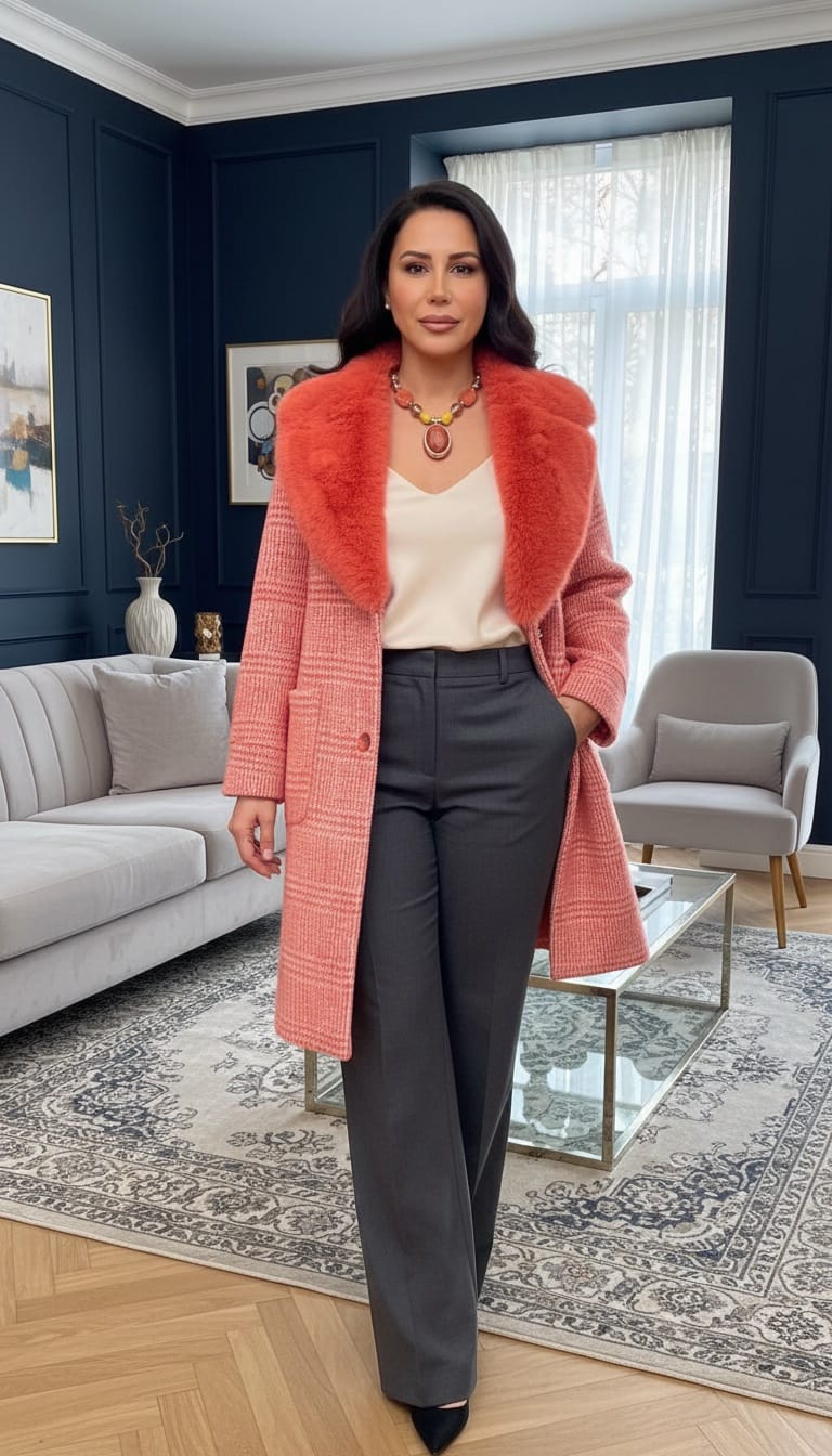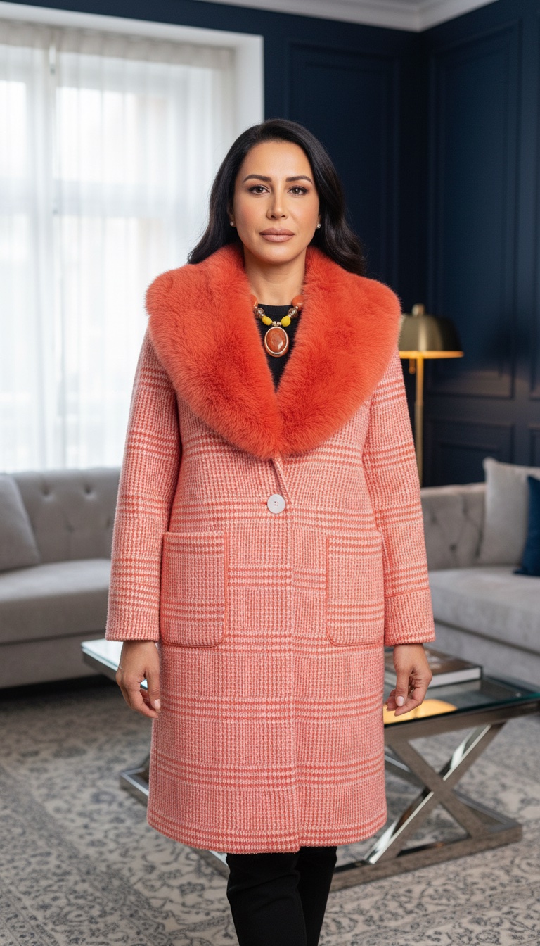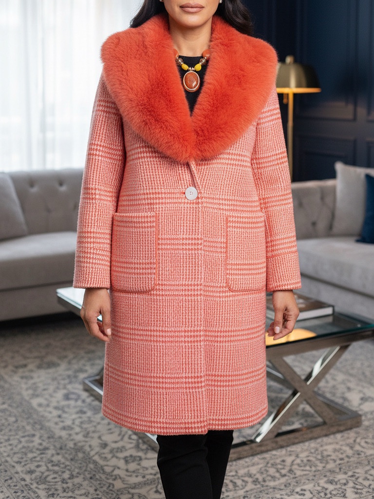 gardırobunuza sofistike ve çarpıcı bir dokunuş katın. Klasik kesimli bu palto, geleneksel tüvit (veya ekose) desenli kalın kumaşı, modern ve cesur bir kontrastla birleştiriyor. Paltonun gövdesindeki narin şeftali/mercan tonlarındaki mikro desen (muhtemelen houndstooth ya da küçük ekose) ve yakasındaki canlı turuncu tonlardaki büyük, hacimli suni kürk detayı, anında dikkat çeken lüks bir görünüm yaratıyor. Hem gündüz şıklığında hem de akşam davetlerinde fark yaratmak isteyenler için mükemmel bir seçimdir.