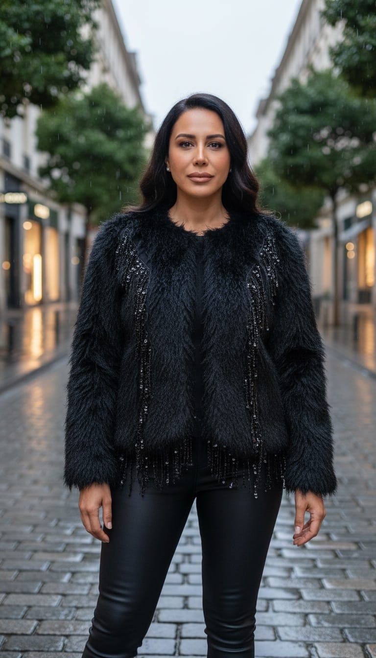 Kombinin odak noktası, lüks ve dikkat çekici bir hava katan siyah tüylü bir cekettir (veya hırkadır).